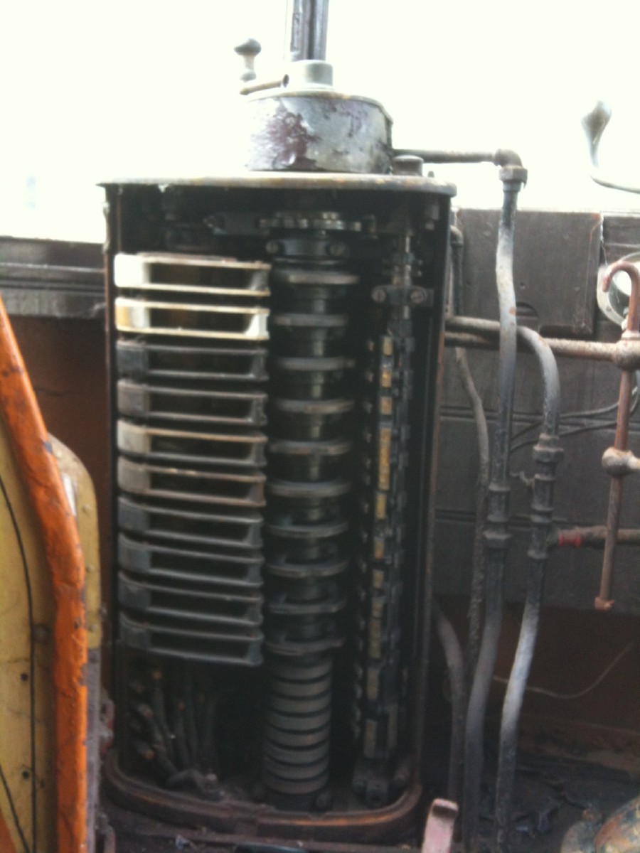 Inside one very tired No.1 end controller of 488, not inspected since it left Glasgow way back in 1961. An old paint